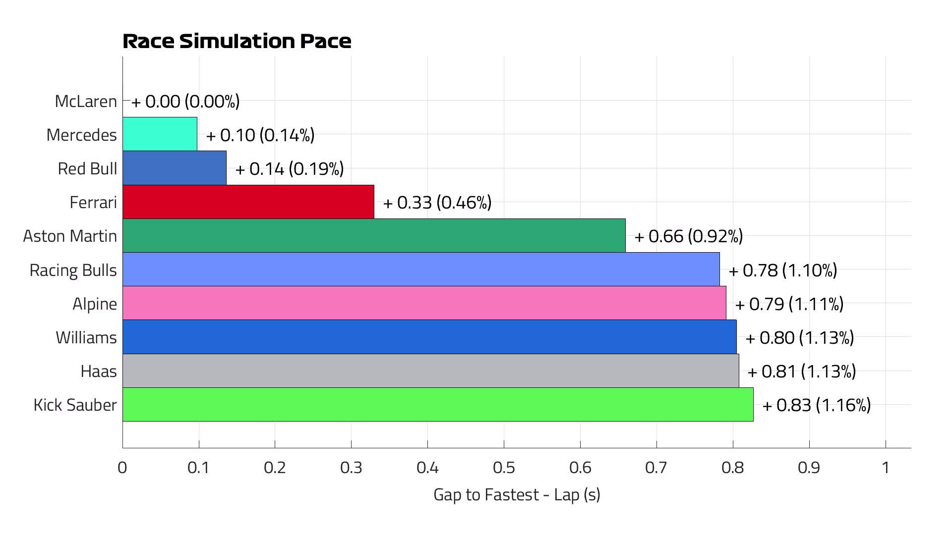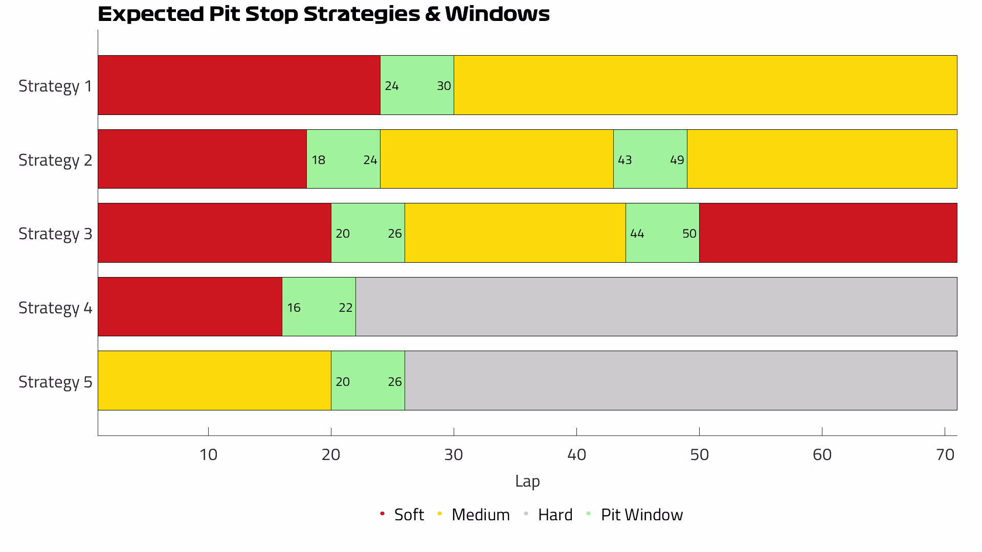 Согласно симуляциям Pirelli, стратегия «софт»-«медиум» очень близка по времени на круге к гонкам по схемам «софт»-«медиум»-«медиум» и «софт»-«медиум»-«софт». Фактически, «софт»-«медиум»-«медиум» могла бы быть быстрее, если бы не погрешность, которую нужно учитывать из-за потери времени при обгоне машин, идущих на одном пит-стопе.