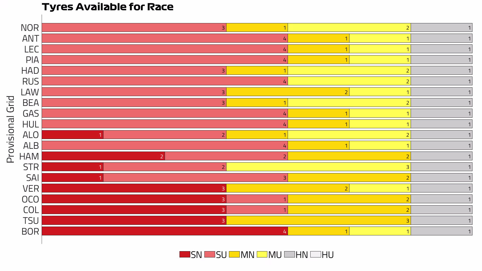 Что делает эту стратегию еще более рискованной для топ-10, так это то, что ни у кого из пилотов не осталось новых шин «софт», хотя у гонщиков в задней части пелотона их в достатке.