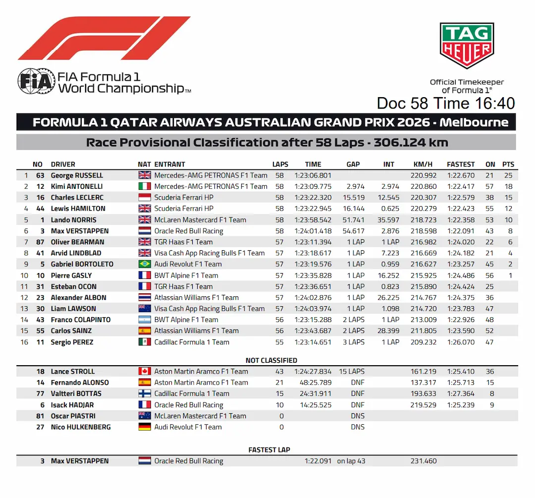 Джордж Расселл одержал победу на открывающем сезон 2026 года Гран-при Австралии. Британец финишировал впереди своего напарника Кими Антонелли, обеспечив Mercedes победный дубль. В этой насыщенной событиями гонке Серебряные стрелы опередили дуэт пилотов Ferrari благодаря успешно сработавшей стратегии с одним пит-стопом.